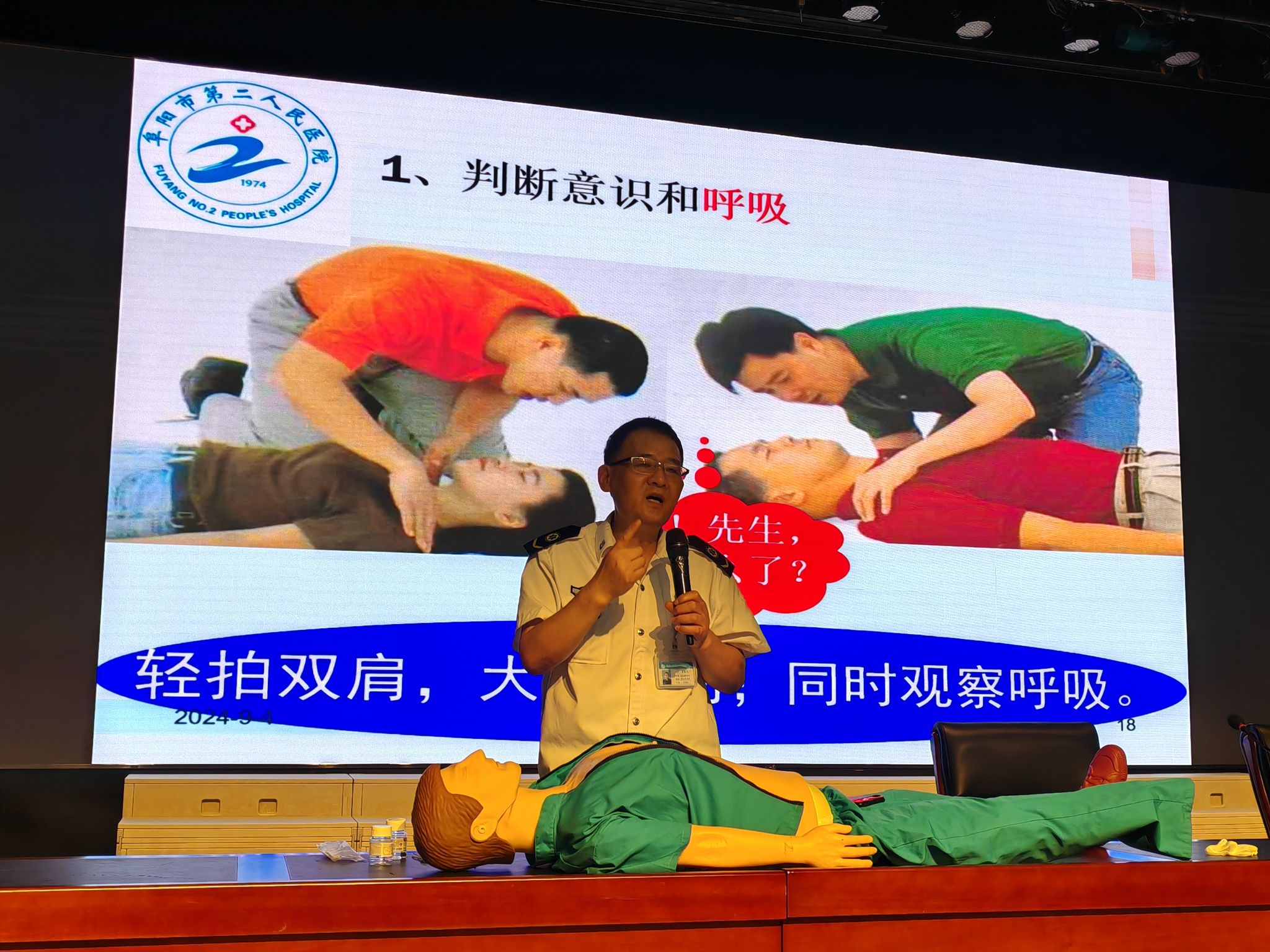 活动中,阜阳市第二人民医院副主任医师、急救分站吴龙飞副站长通过理论讲解和实际操作相结合的方式,重点对开展心肺复苏的按压方法、位置、手法、频率和深度进行讲解示范,并生动形象地宣传普及了如何在紧急情况下进行心肺复苏等急救措施,部分师生代表在专业人员指导下,积极踊跃的进行了现场实践,确保了参与师生掌握正确的急救技能。