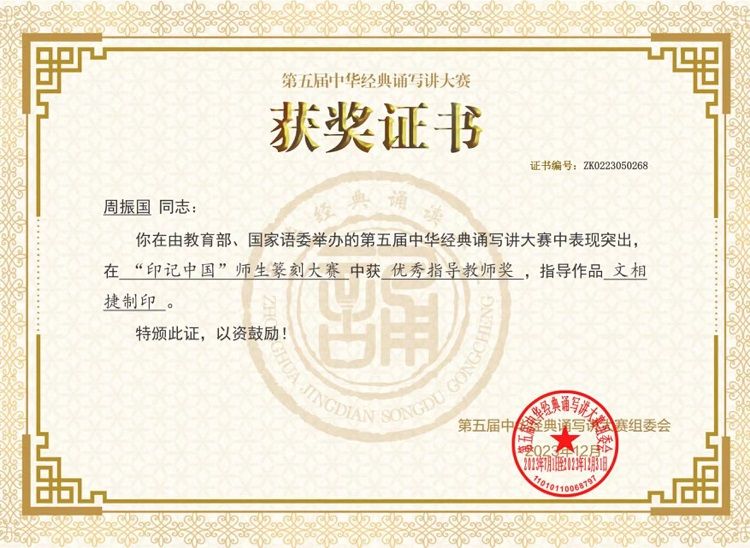 据了解,此次活动由教育部、国家语委主办,历时10个月。在全国广大师生和社会各界积极参与下,该赛事参赛人次达965万,涌现出一大批优秀作品。经过激励的初赛和决赛角逐,我校学生文相捷的篆刻作品在大赛中荣获一等奖,我校教师周振国获“优秀指导教师奖”。