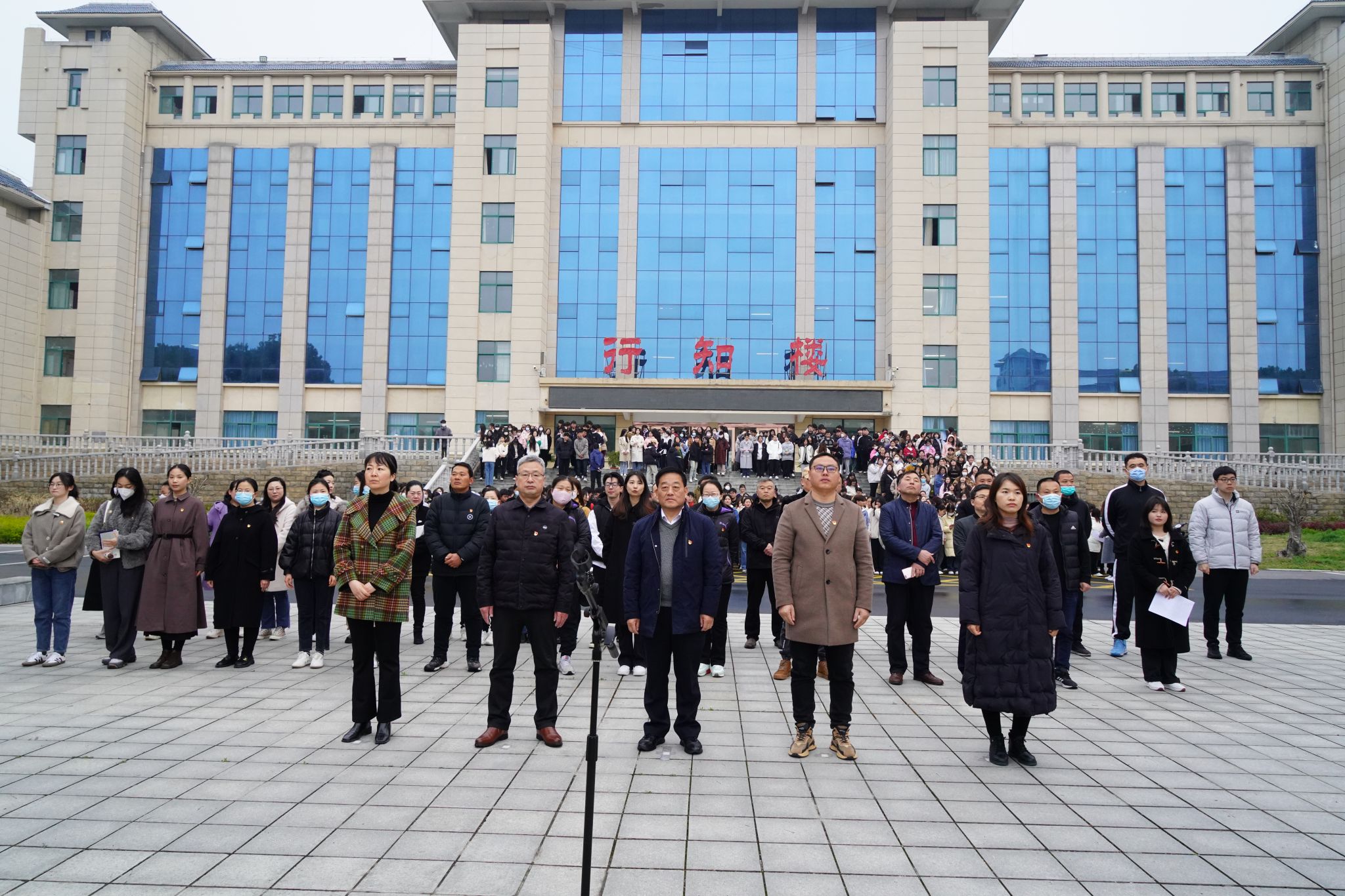 迎着朝阳,在国旗护卫队的护送下,全院师生的庄严注目下,伴随着雄壮激昂的《义勇军进行曲》,鲜艳的五星红旗缓缓上升,在微风中高高飘扬。