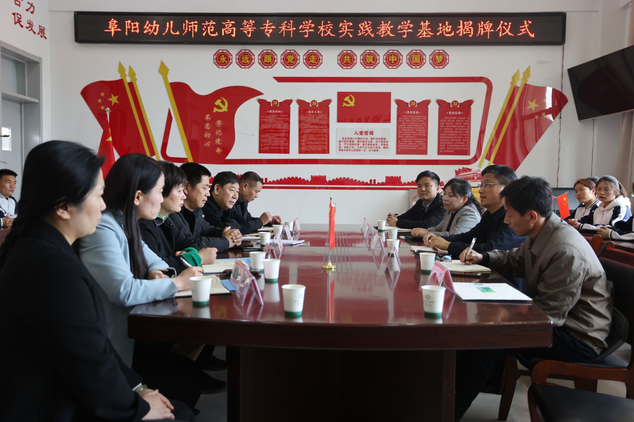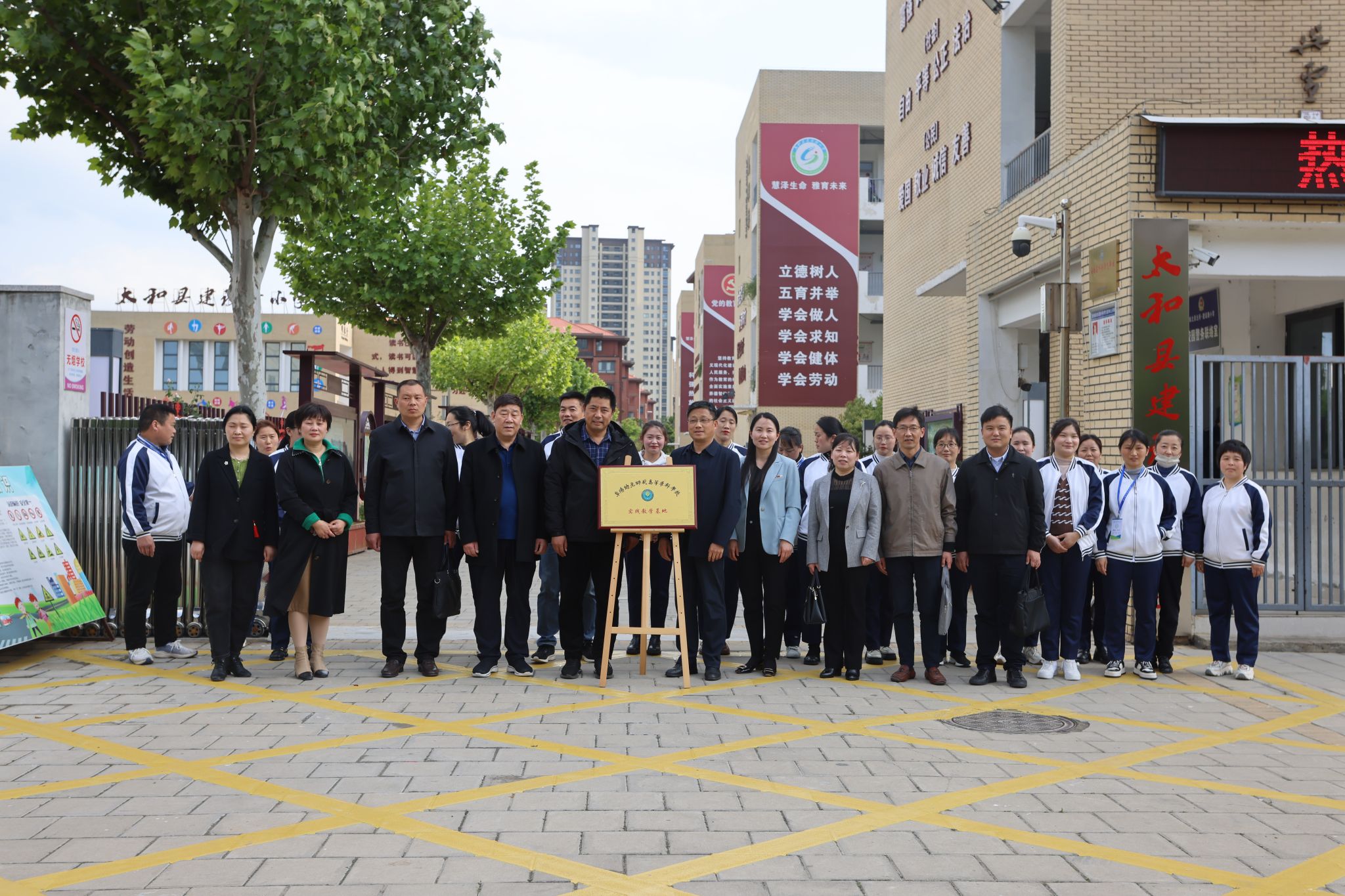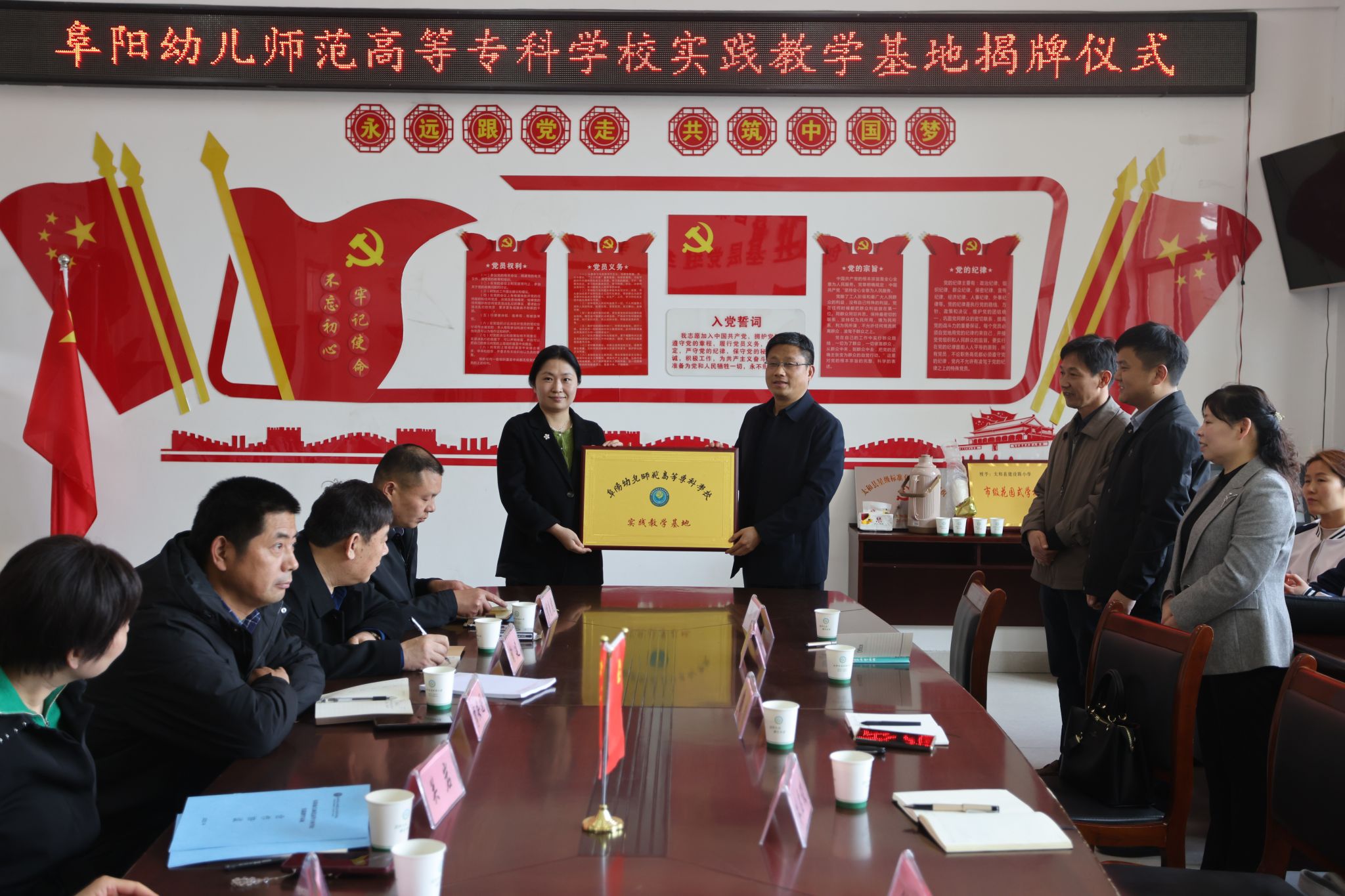 汤志、李安国为学校建设路小学实践教学基地揭牌,学校小学教育学院院长郭玉敏与太和县建设路小学、太和一小、太和三小、太和四小签订实践教学基地协议。