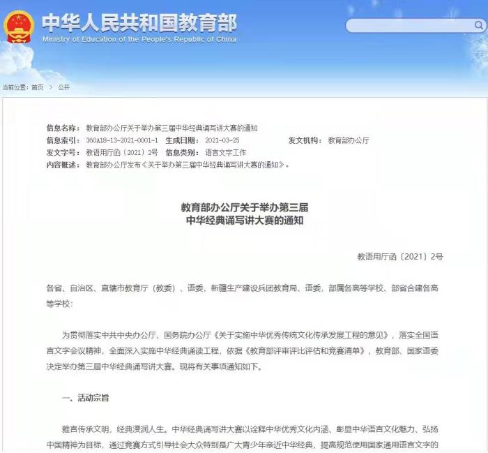 近日,由教育部、国家语委主办的第三届中华经典诵写讲大赛圆满落下帷幕。本届大赛以“传承中华经典,庆祝建党百年”为主题,通过“诵读中国”经典诵读大赛、“诗教中国”诗词讲解大赛、“笔墨中国”汉字书写大赛、“印记中国”学生篆刻大赛四项分赛事,采用竞赛、展演等方式,庆祝中国共产党成立100周年,歌颂建党百年光辉历程,展现举世瞩目伟大成就,引导社会大众亲近中华经典、传承弘扬中华优秀文化、增强文化自信。