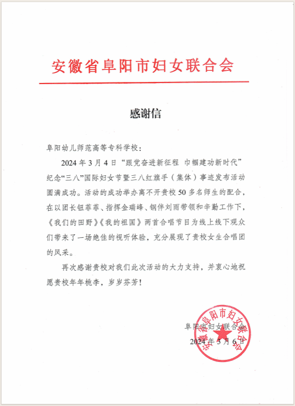 近日,市妇联向我校发来感谢信,对我校参加阜阳市“跟党奋进新征程 巾帼建功新时代”纪念“三八”国际妇女节暨三八红旗手(集体)事迹发布活动文艺演出的女子合唱团师生给予充分肯定和表扬,并向我校和学校女子合唱团的大力支持表示感谢。