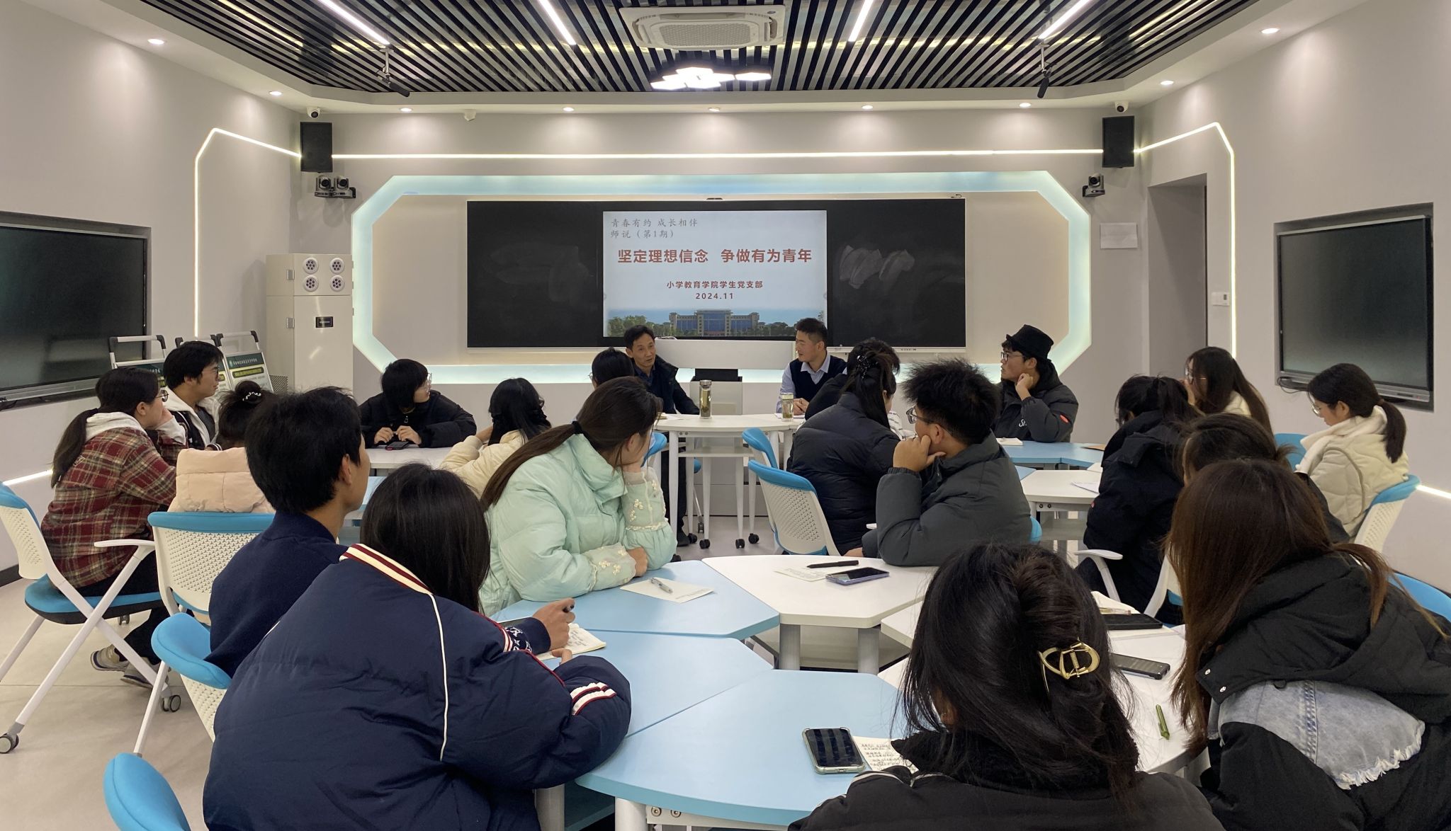为深入学习贯彻党的二十届三中全会精神,推动全会精神在新时代大学生心中生根,进一步加深2024级学生对党的认识,端正入党动机,11月25日下午,由我校辅导员名师工作室主办,小学教育学院学生党支部承办的师说沙龙(第1期)以“坚定理想信念,争做有为青年”为主题,在文津楼403成功举办。本期师说沙龙邀请了小学教育学院党总支书记朱启俊,2024级入党申请人参加,活动由小学教育学院学生党支部书记刘磊主持。