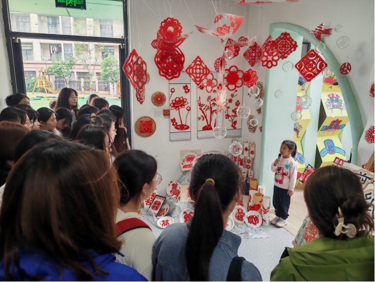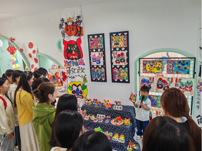 活动当天,幼儿园的非遗美术作品展宛如一座童趣盎然的艺术殿堂。一幅幅充满想象力的儿童作品,将剪纸、泥塑、编织、扎染、拓印等非遗元素巧妙融入其中,展现出孩子们对传统文化的独特理解与创意表达。在教师的引导下,学生们漫步展厅,仔细观察每一幅作品的主题、内容、材料,聆听小小讲解员们介绍他们的作品,感受孩子们在艺术创作过程中的快乐与成长,直观感知幼儿园美术教学的目标、内容和方法,深刻体会到非遗文化融入学前教育的重要价值。同时,他们还与幼儿园教师进行了深入交流,了解到幼儿园教师在组织美术活动、引导幼儿创作过程中所面临的挑战和应对策略,进一步明确了未来的职业发展方向。