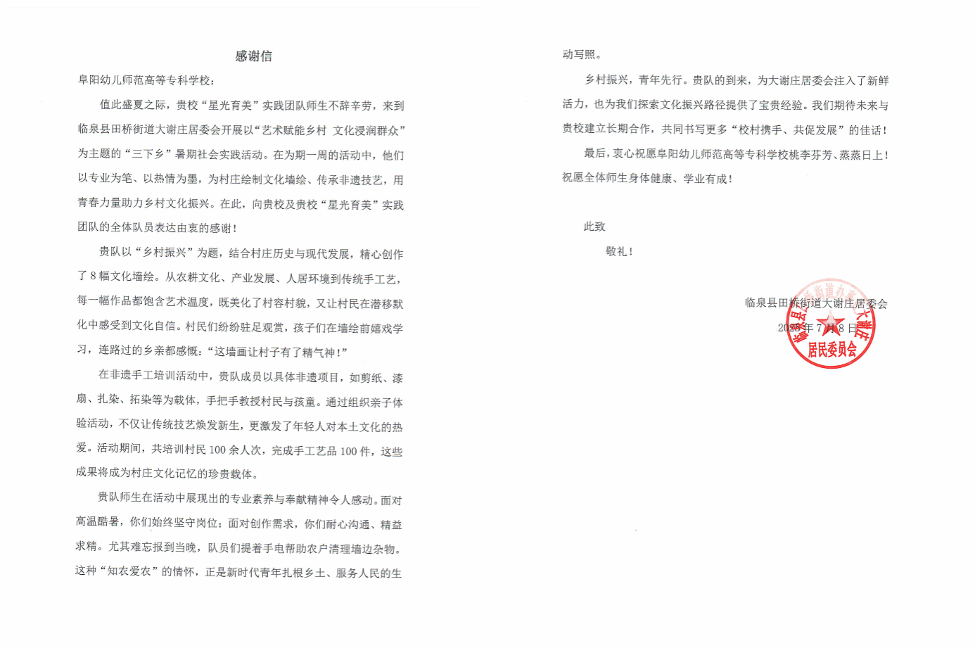 近日,临泉县田桥街道大谢庄居委会一封情真意切的感谢信寄到学校,字里行间满是对艺术和体育学院“星光育美”实践团队的赞誉。这封信不仅是对学子们暑期三下乡工作的肯定,更映照出学院“以美育人、以文化人”的育人理念在乡土间结出的丰硕果实。