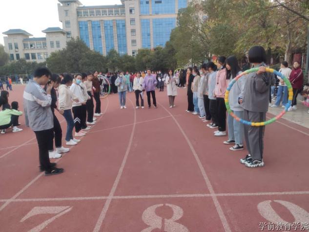 20201113日下午,在操场西南角跑道上,一场以“阳光生活,快乐生活”为主题的趣味呼啦圈比赛正在进行。学前教育学院各班级勇越参加比赛。