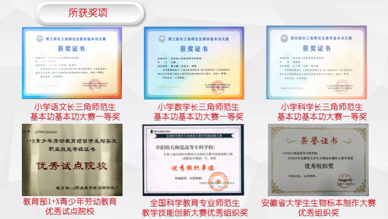 学院重视学生专业实践能力的培养,以学科竞赛和社团活动为载体,促进课堂教学改革,夯实第一课堂,开辟第二课堂,搭建网络课堂,构建“岗课赛证”融通的一体化育人平台,着力培养学生的实践和创新能力。近三年,学生在全国物理创新大赛、全国科学教育专业师范生教学基本功竞赛、全国金相大赛、长三角师范生教学基本功竞赛及安徽省举办的各类竞赛中共126人获奖,其中,国家级一等奖1项二等奖5项三等奖2项;长三角师范生教学基本功大赛一等奖3项二等奖5项三等3项;安徽省高等学校师范生教学技能竞赛一等奖9项二等奖4项三等奖3项,连续三年在安徽省及阜阳市科普宣讲比赛中获得一等奖,2021年获安徽省生物标本制作大赛优秀组织奖,2022年获阜阳市科普宣讲竞赛优秀组织奖,2022年获全国科学教育专业师范生教学基本功竞赛优秀组织奖。